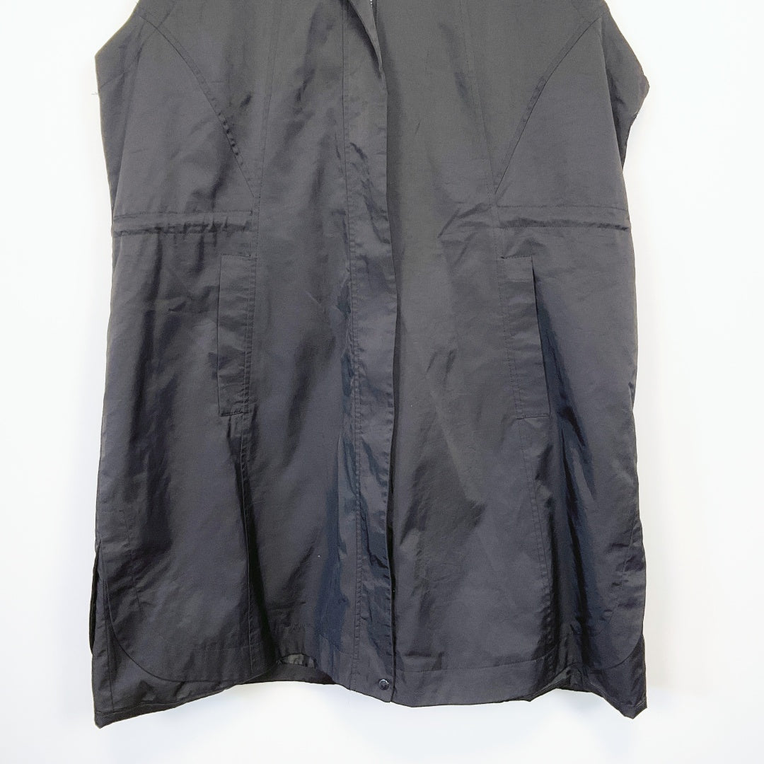 Yvonne Black sleeveless vest coat. Knee length coat with hood, great for winter weather to keep sheltered from wind and rain.Β